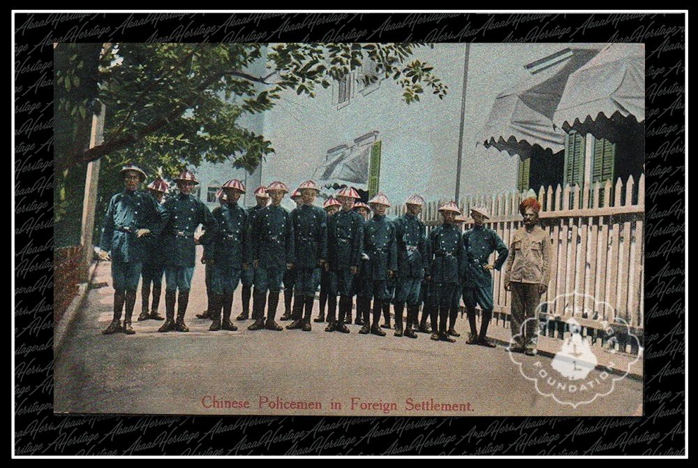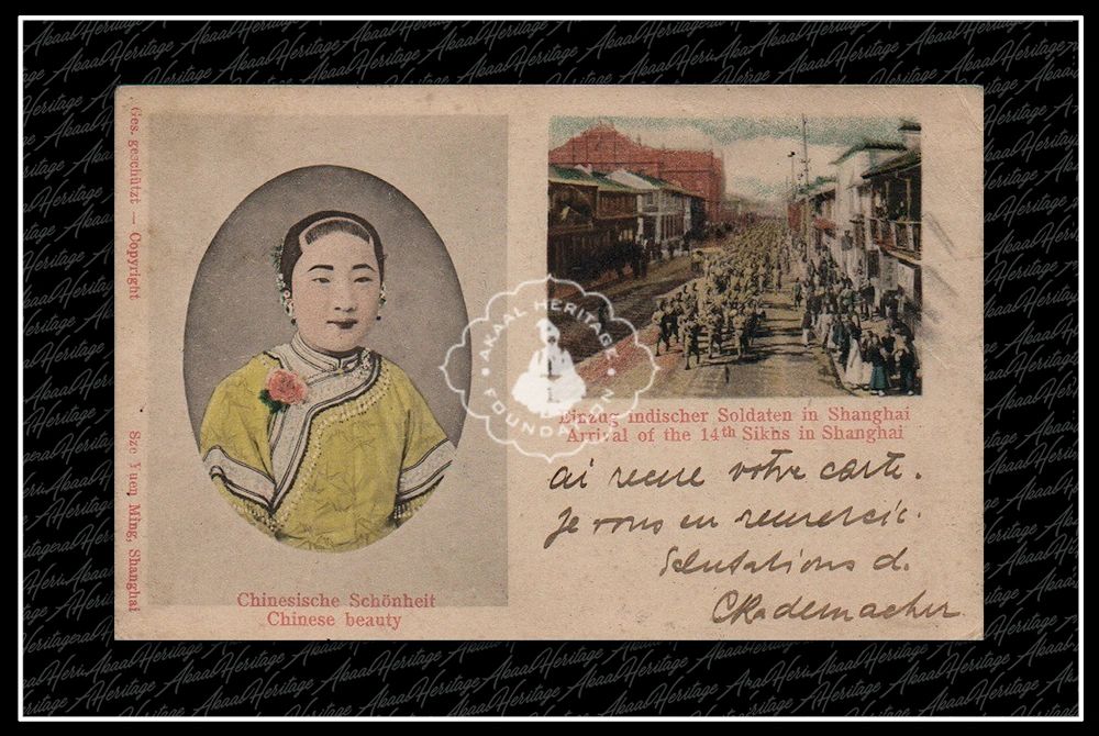 Multi-view postcard with left side showing a Chinese beauty, and right side showing arrival of 14th Sikhs in Shanghai. Printed colour postcard. c1900s