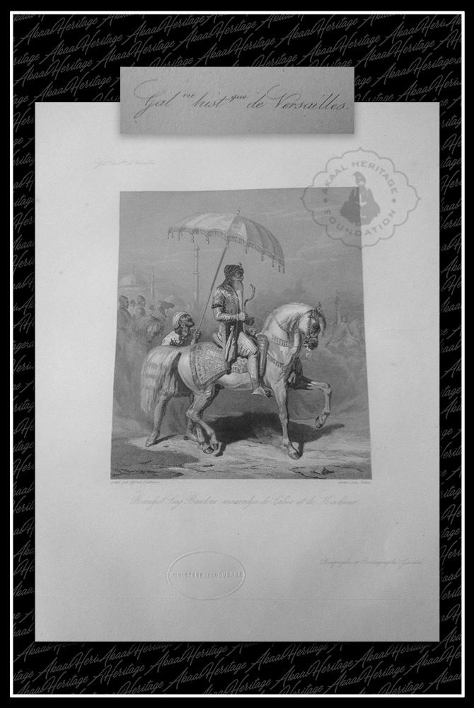 Original steel engraving of Maharaja Ranjit Singh on Horseback with attendants entering Kashmir.
